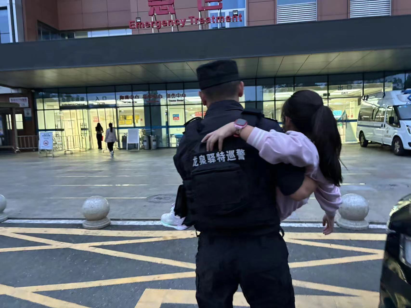 到达医院后,队员将女孩抱下警车,送往急诊,与此同时积极协助女孩家属挂号就医,直至女孩在医院得到妥善救治。
