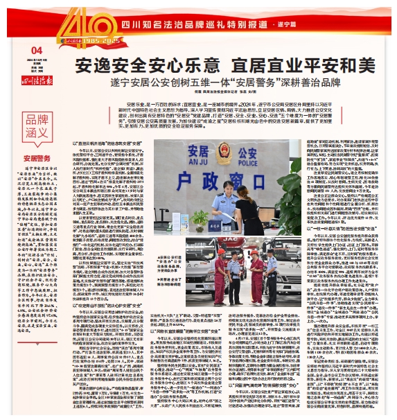 遂宁市安居区古以“安居乐业”为吉祥,故以“安居”命名至今。从泥泞荒土到高楼林立,安居从一个农业底子薄、工业零起步的小集镇发展到如今成绩亮眼的诗意栖居生态公园名城。今年以来,遂宁市公安局安居区分局瞄定遂宁市公安局党委赋予的“倍增”定位,紧扣安居区委“打造新标杆、争创百强区”主轴主调,立足打造“成渝地区营商环境新高地”。贯彻落实省公安厅部署实施为期三年的“深耕善治”计划,创树出“安居、安全、安业、安心、安逸”五个维度为一体的“安居警务”品牌,在维护政治安全、守护社会平安、优化营商环境、服务中心大局等工作中忠诚履职、担当作为。今年以来,安居全区刑事、行政案件发案率同比下降20.6%、4.8%,公安社会评价安全感满意度达到97.6%,稳居全市前列。今日之安居,正是宜居宜业,安逸安居。
