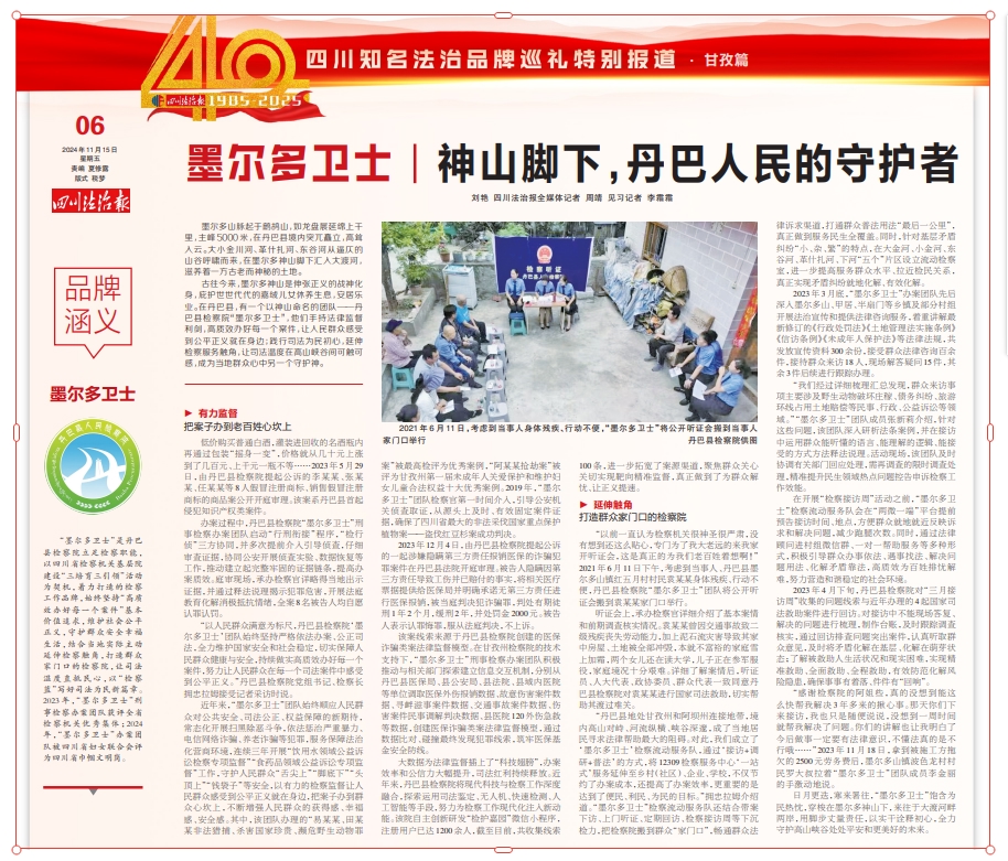 “墨尔多卫士”是丹巴县检察院立足检察职能,以四川省检察机关基层院建设“三培育三引领”活动为契机,着力打造的检察工作品牌,始终坚持“高质效办好每一个案件”基本价值追求,维护社会公平正义,守护群众安全幸福生活,结合当地实际主动延伸检察触角,打造群众家门口的检察院,让司法温度直抵民心,以“检察蓝”写好司法为民新篇章。2023年,“墨尔多卫士”刑事检察办案团队获评全省检察机关优秀集体;2024年,“墨尔多卫士”办案团队被四川省妇女联合会评为四川省巾帼文明岗。
