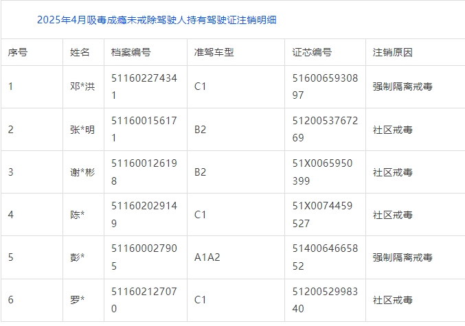 本次被注销驾驶证的6名人员中,2人因“强制隔离戒毒”、4人因“社区戒毒”被依法注销驾照,涉及准驾车型包括C1、B2、A1A2等。