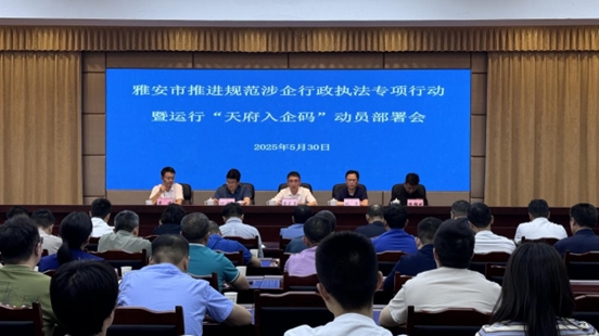 5月30日,雅安市司法局组织召开全市推进规范涉企行政执法专项行动暨运行“天府入企码”动员部署会,旨在深入学习贯彻习近平法治思想,全面贯彻落实中央经济工作会议的有关要求,着力解决涉企行政检查中的突出问题,以“亮码入企”小切口推动检查规范化、精准化,切实减轻企业负担。雅安市人民政府副市长、市公安局局长黄芝晏出席会议并讲话。