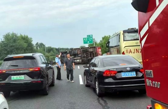 近日,绵阳市盐亭县人民法院执行干警前往成都市双流区执行完毕案件后,在返程途径成巴高速京唐段时,发现前方因一辆大型货车侧翻在高速公路中央,装载的铜芯卷材散落一地,占据全部车道,导致交通堵塞中断。
