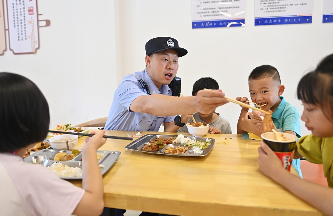 三人刚好坐下准备吃饭,突然一个孩子哇地哭了起来,原来他刚泡好的方便面倒在了地上。“男子汉莫哭莫哭,我去给你打饭。”蒋成军安慰着小男孩。