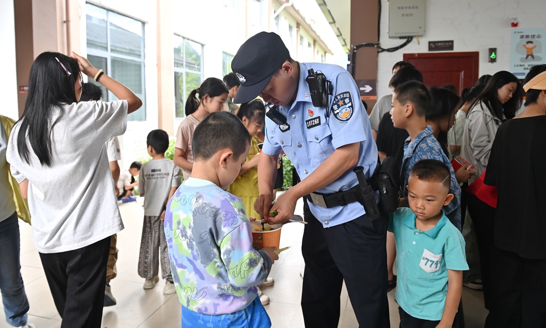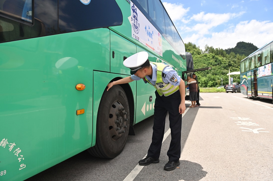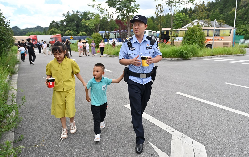 民警及工作人员则悉心照料每一位“小候鸟”,时刻关注他们的需求与安全。中午1点,车队到达重庆黑溪服务区,这是本次行程中的第一个休息点。乘坐5号车的民警陈锐第一个下车,在确保停车区附近安全的前提下,他向“小候鸟”们挥手示意可以下车了,孩子们这才有序排队前往休息区。