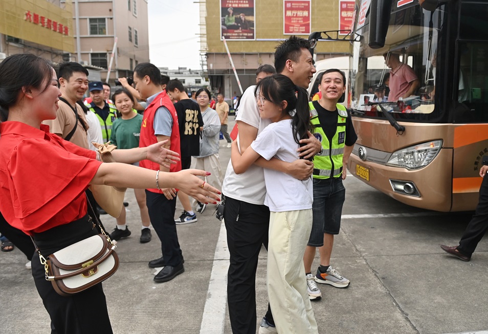 经过约27个小时、跨越1500公里的昼夜兼程,车队于7月4日上午11时许平安抵达东莞市大朗镇巷头毛织文化广场。车门开启,孩子们欢呼雀跃,飞奔扑入久候父母的怀抱,现场瞬间被浓浓的亲情与团聚的喜悦包围着。