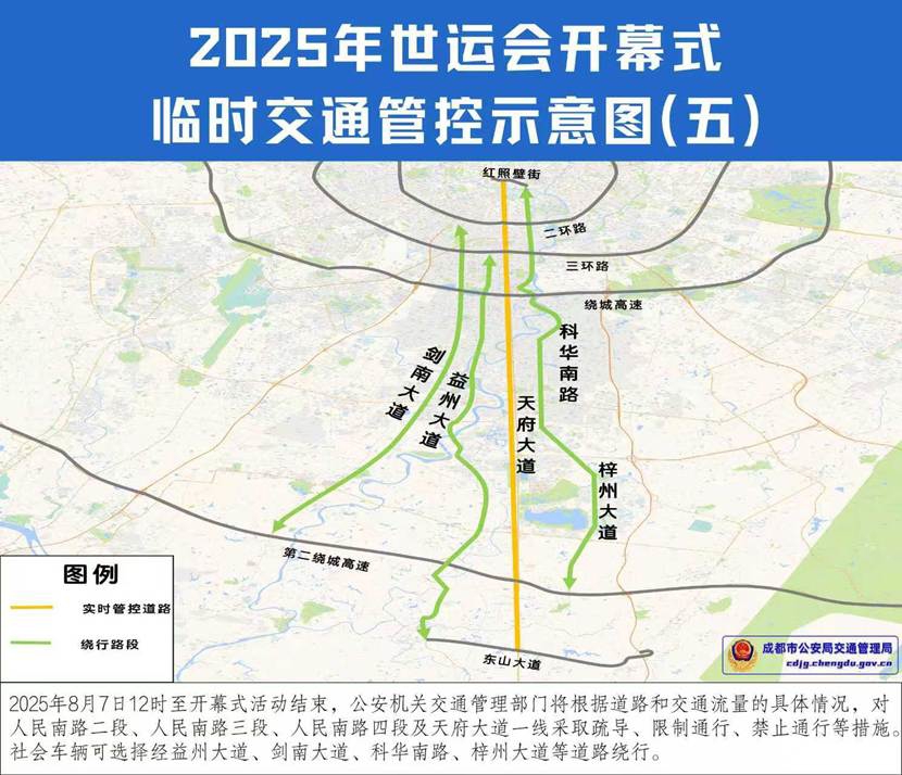 五、2025年8月7日12时至开幕式活动结束,公安机关交通管理部门将根据道路和交通流量的具体情况,对人民南路二段、人民南路三段、人民南路四段及天府大道一线采取疏导、限制通行、禁止通行等措施。社会车辆可选择经益州大道、剑南大道、科华南路、梓州大道等道路绕行。