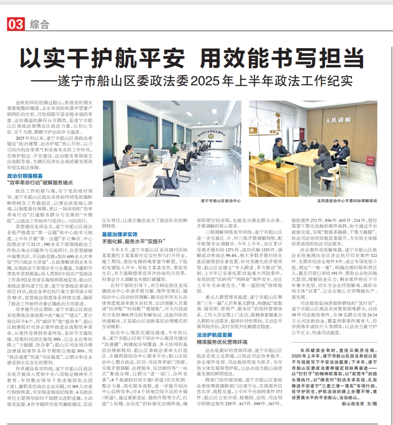 长风破浪会有时,直挂云帆济沧海。2025年上半年,遂宁市船山区政法系统以实干与效能写下平安法治篇章;下半年,遂宁市船山区委政法委将锚定目标再奋进——以“钉钉子”的精神抓落实、以“拓荒牛”的劲头强执行,以“绣花针”的功夫求实效,扎实推进平安遂宁“三查三清一落实”专项行动,在守护民生、护航法治的路上步履不停,建设更高水平的平安船山、法治船山。