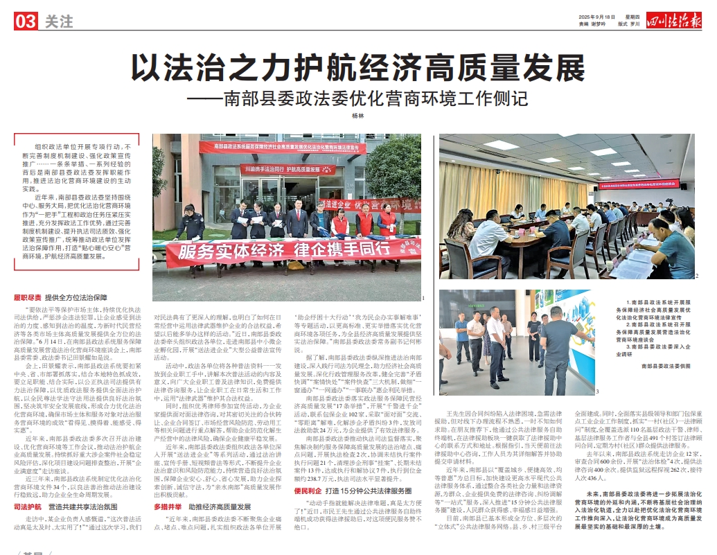 近年来,南部县委政法委坚持围绕中心、服务大局,把优化法治化营商环境作为“一把手”工程和政治任务压紧压实推进,充分发挥政法工作优势,通过完善制度机制建设、提升执法司法质效、强化政策宣传推广,统筹推动政法单位发挥法治保障作用,打造“贴心暖心安心”营商环境,护航经济高质量发展。