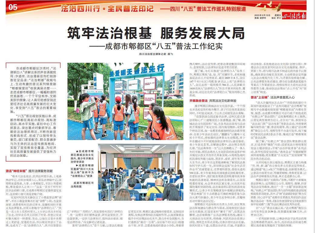 在成都市郫都区沙湾村,“法律明白人”讲解法条的声音清脆悦耳;步道旁,法治漫画宣传栏前游客驻足品读;“法治郫都”视频号上,生动有趣的普法系列情景剧“郫都案里说”收获满屏点赞……走进成都市郫都区,一幅幅和谐的优美画卷,一个个平安有序、文明美好的景象,让人真切地感受到这里经济社会高质量发展的巨大变化,享受到“八五”普法的累累硕果。