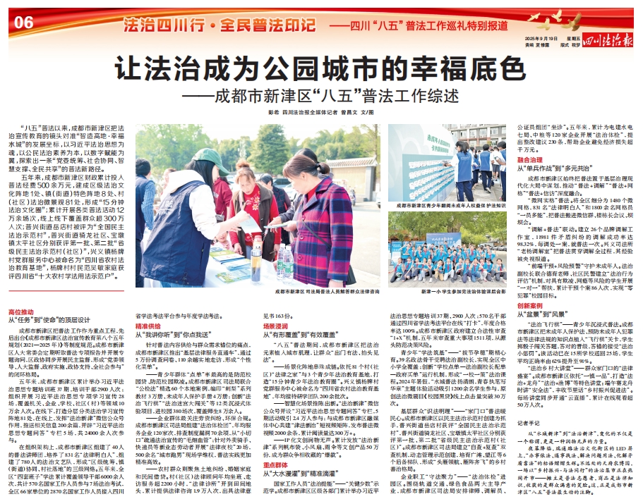 “八五”普法以来,成都市新津区把法治宣传教育的镜头对准“智造高地·幸福水城”的发展坐标,以习近平法治思想为魂,以公民法治素养为本,以数字赋能为翼,探索出一条“党委统筹、社会协同、智慧支撑、全民共享”的普法新路径。