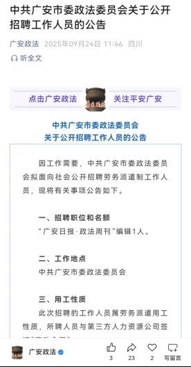 9月24日,记者从广安市委政法委员会获悉,广安市委政法委员会发布公开招聘公告,拟面向社会招录“广安日报·政法周刊”编辑 1 名,用工性质为劳务派遣制,报名截止至 2025 年 9 月 30 日。