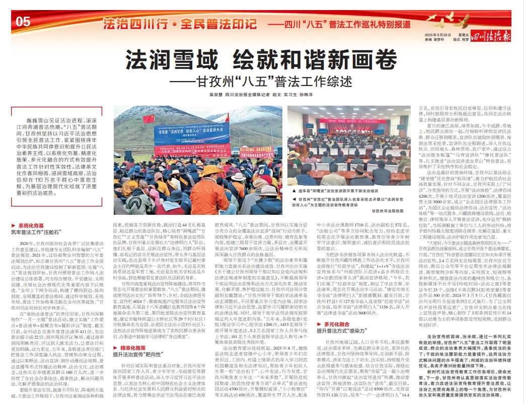 巍巍雪山见证法治进程,滚滚江河奔涌普法热潮。“八五”普法期间,甘孜州坚持以习近平法治思想引领全民普法工作,紧紧围绕铸牢中华民族共同体意识和提升公民法治素养主线,以系统化夯基、精准化施策、多元化融合的方式有效提升普法工作针对性实效性。法律条文化作春风细雨,浸润雪域高原,法治信仰在110万名干群心中落地生根,为基层治理现代化绘就了浓墨重彩的法治底色。