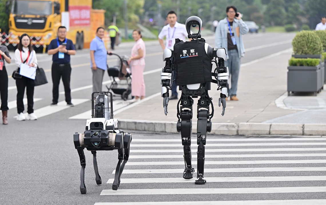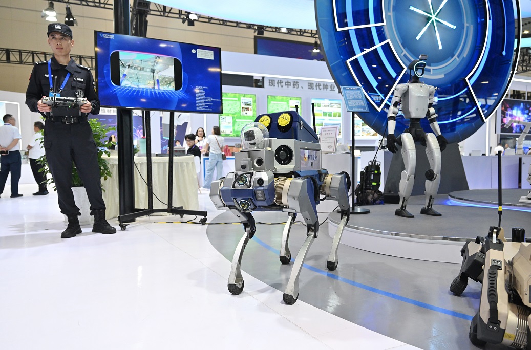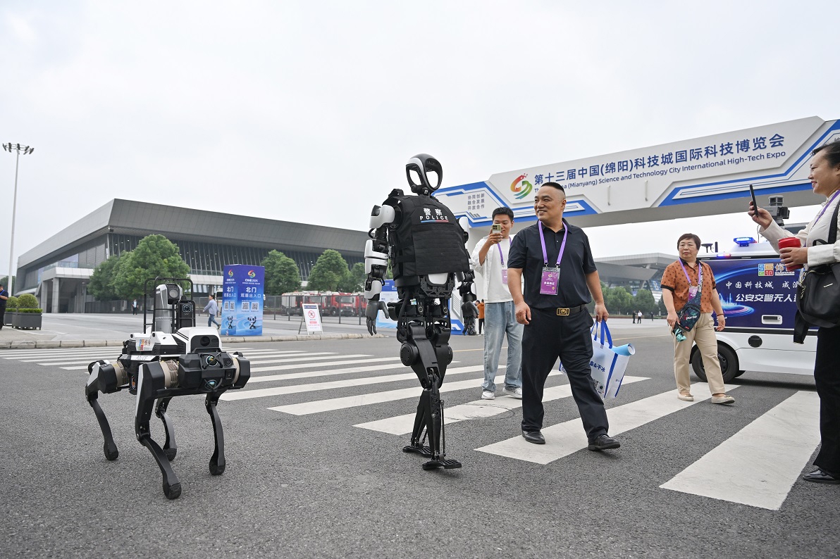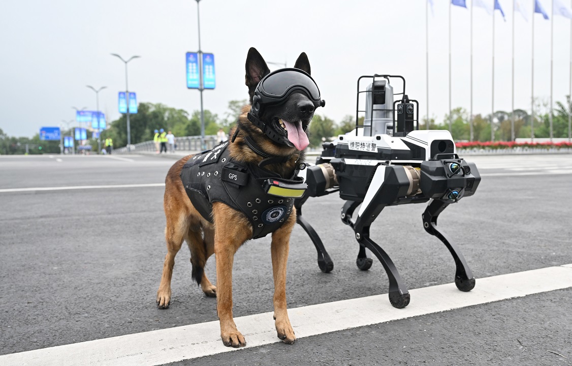 9月26日,第十三届中国(绵阳)科技城国际科技博览会(以下简称科博会)开幕式在绵阳九洲体育馆举行。绵阳公安联合科技企业,充分发挥“科技+警力”优势,多台(套)机器人、机器狗、无人车、无人机等高新技术装备在今年科博会安保工作中集中“上岗执勤”,为市民提供零距离巡逻守护和智能服务。