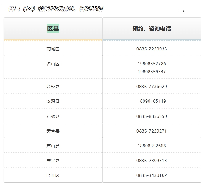 雅安市各县(区)治安(户政)窗口提供预约咨询服务,可通过下方电话提前预约。