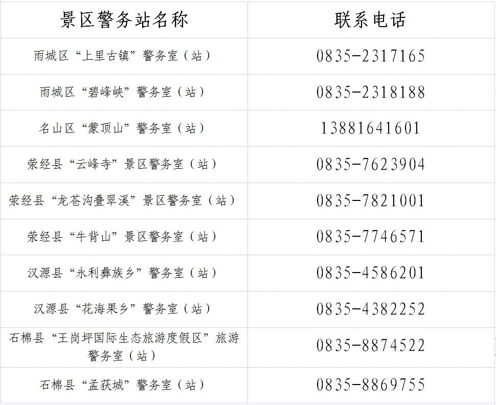 8.事故处理专项服务。开设碧峰峡(上里)景区黄龙桥、周公山景区八角亭、多营茶马古道、雨城区经二路四个交通事故前置处理点位,同步开通医救绿色通道,强化“警保联动”机制,及时快速处理轻微交通事故。