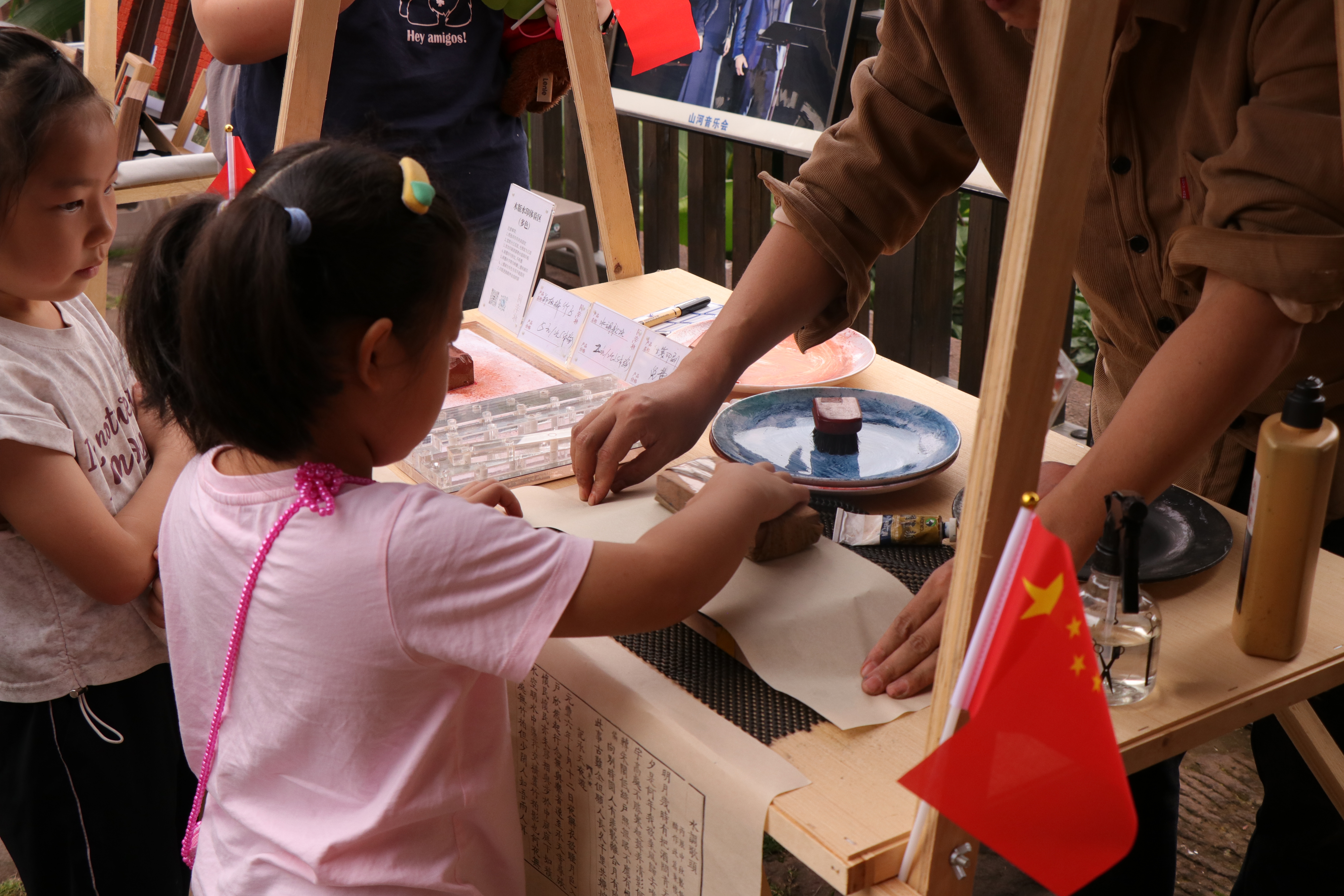 在幸福古村,雕版印刷非遗传承人王长杰、王亮正在指导孩子们体验雕版印刷。“慢点刷墨,均匀用力……”他们手把手教着小游客们。当宣纸上渐渐显现出“花好月圆”的字样时,来自重庆的陈雨淑兴奋地跳起来:“我要把这个带回家挂在书桌前!”游客们轮番体验,沉浸在动手的乐趣中。