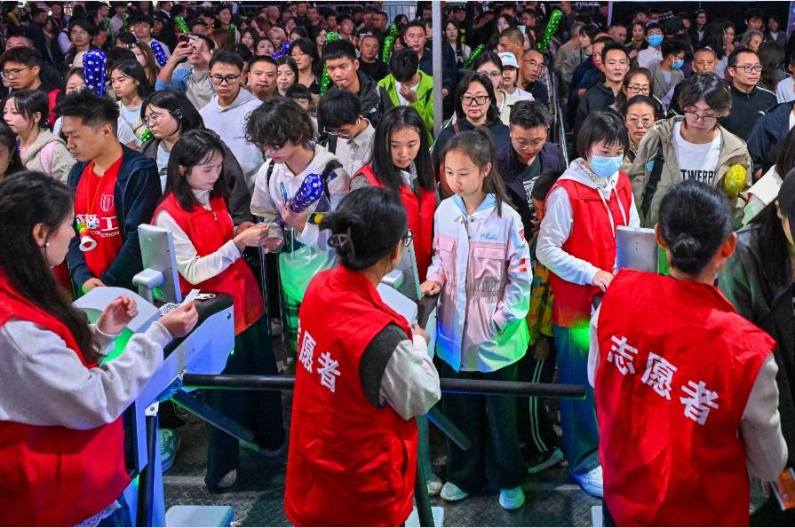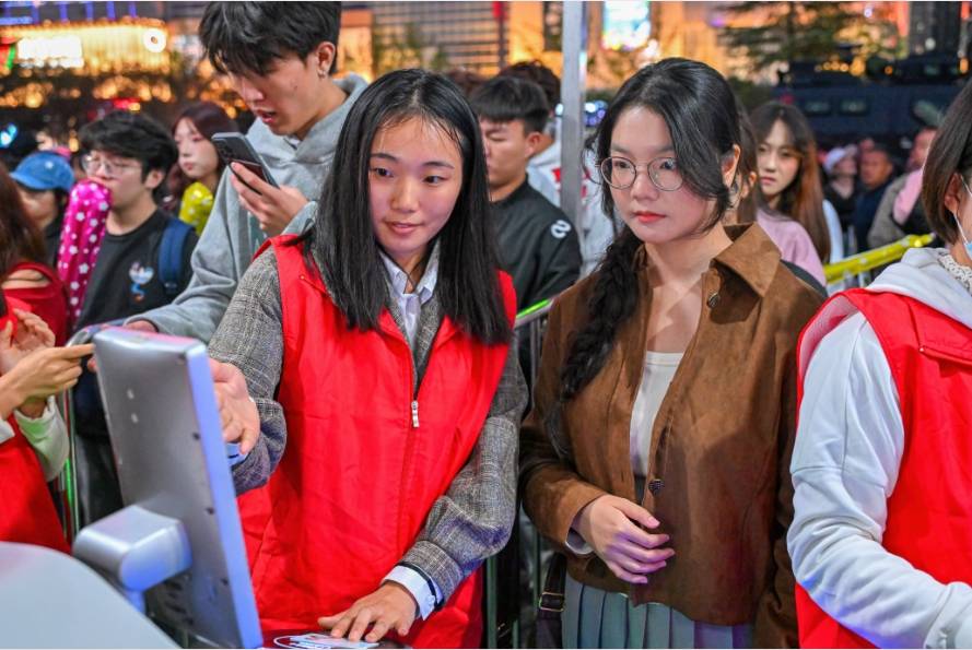 “请大家注意安全,有序排队安检。”志愿者邹晴柔早在下午4点钟就来到了现场,她主要负责10号主出入口的检票工作。