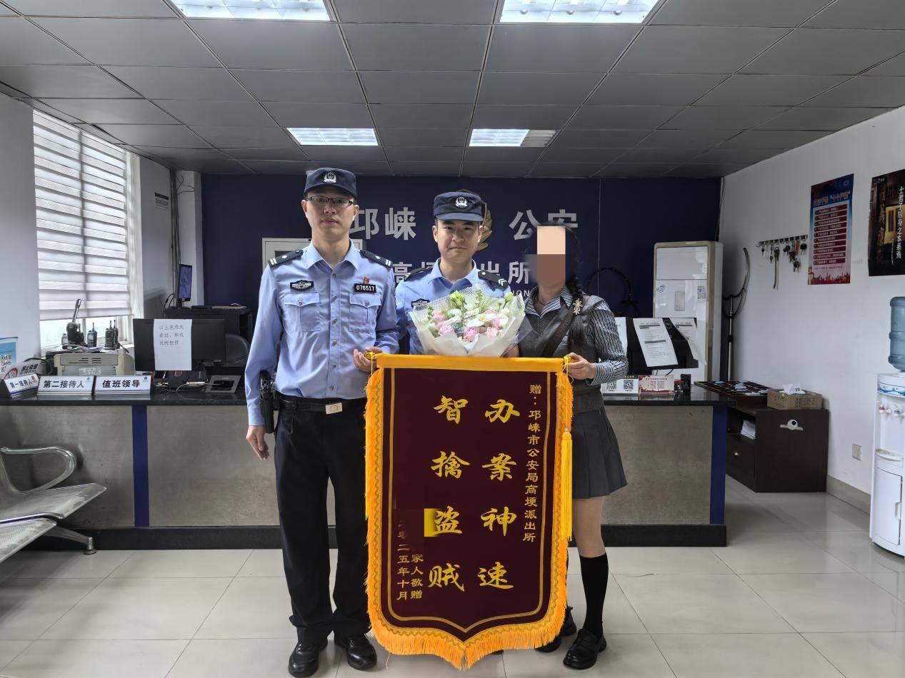 10月17日清晨,市民王女士冒雨来到邛崃市公安局高埂派出所,将一面写有“办案神速 智擒盗贼”的锦旗送到民警手中,对派出所快速破案、及时为其挽回经济损失表示衷心感谢。