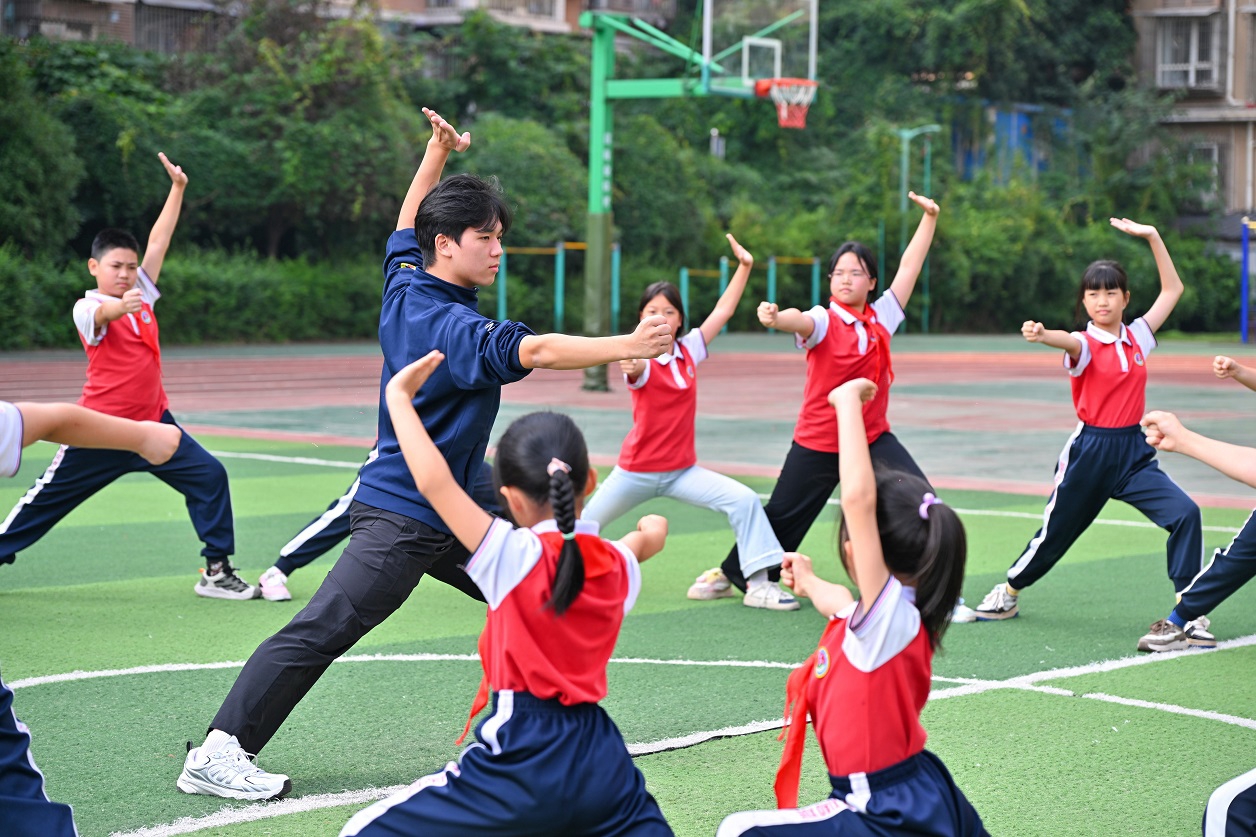 作为仁寿县首批“特色学校”,东方红小学将武术深度融入校园生活。学校不仅将武术纳入常态化教学,确保每班每周都有专业课程,更逐步拓展出五步拳、长拳等传统套路,以及刀、枪、棍、剑等器械内容。“我练得最好的是刀法,还想学习更酷的招式!”学生刘乐阳兴奋地说。