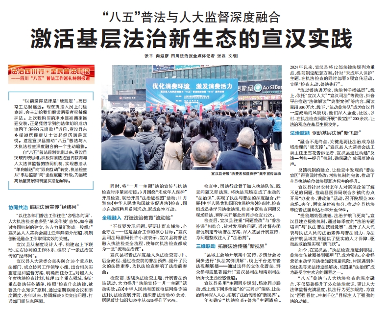 “八五”普法与人大执法检查的深度融合,不仅显著提升了公众法治意识,更让人大法律监督充满温度、执法行为更加规范,为宣汉“百强晋位、冲刺千亿”目标注入了强劲的法治动能。