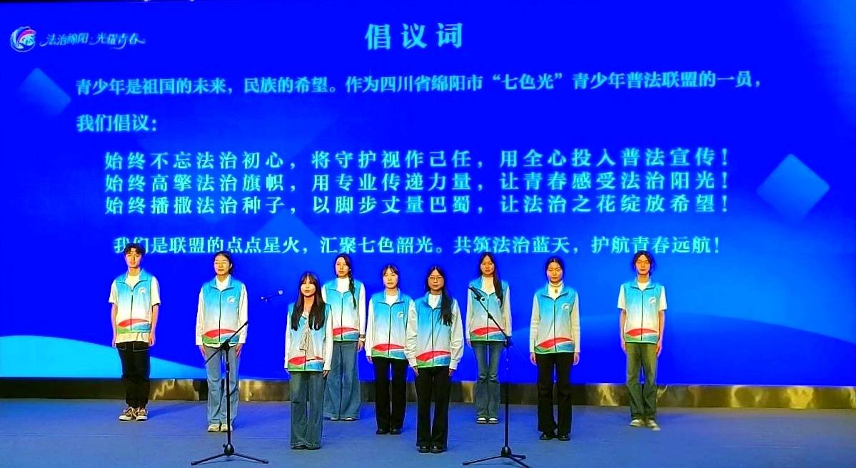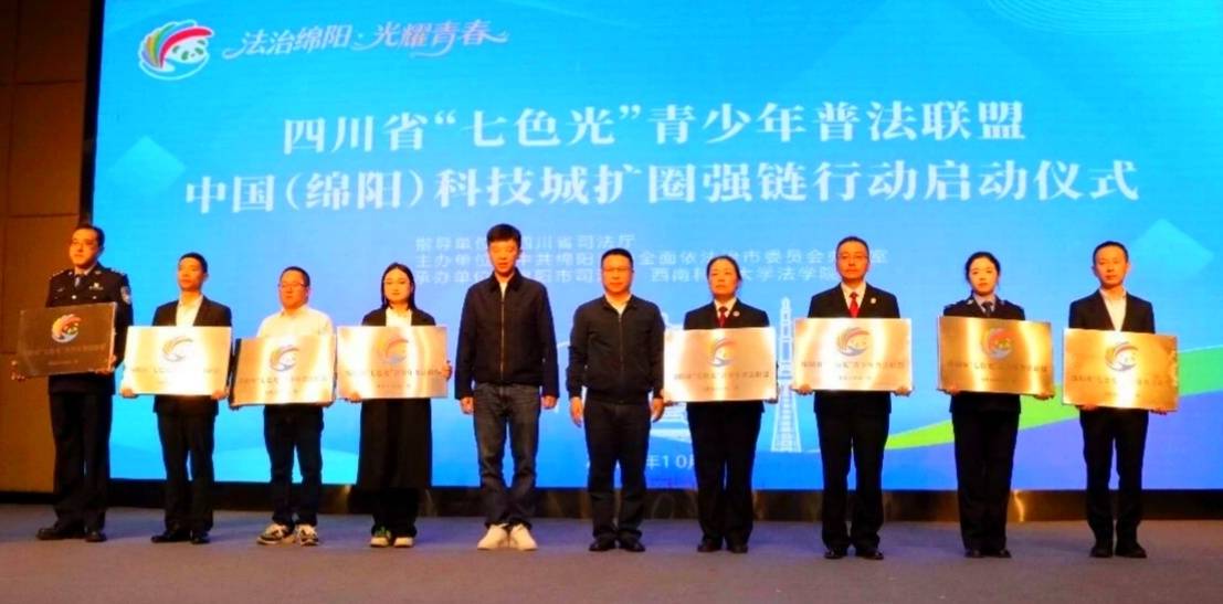 活动现场,为绵阳市首批22家“七色光”联盟成员授牌。西南科技大学“稚禾”法治辅导员团队、绵阳市“熊猫未士”未检团队、新华强制隔离戒毒所“蓝影”志愿服务队分享了普法实践经验。大学生志愿者与联盟成员代表共同发出行动倡议,彰显普法新力量的责任与担当。