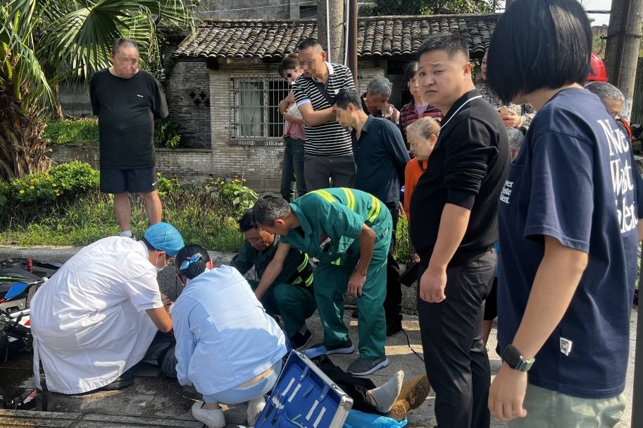 当日,大安法院执行局外勤组两名干警刘琦、古洢凡和司机张晓龙正前往执行现场,途经杨家冲扳道房时,眼前的一幕让他们立刻警觉——一名男性驾驶员倒在路边,已失去意识,其所驾摩托车侧翻在旁,车身零件散落,现场情况危急。两名干警当即停车,与同行司机迅速下车查看,并立即拨打急救电话和报警电话,清晰告知事故地点、伤者状态及现场情况。等待救援的过程中,干警们始终坚守现场,一方面密切关注伤者身体状况,轻声呼唤试图唤醒伤者,另一方面,主动疏导周边交通,提醒途经车辆减速慢行,保障现场秩序与通行安全。