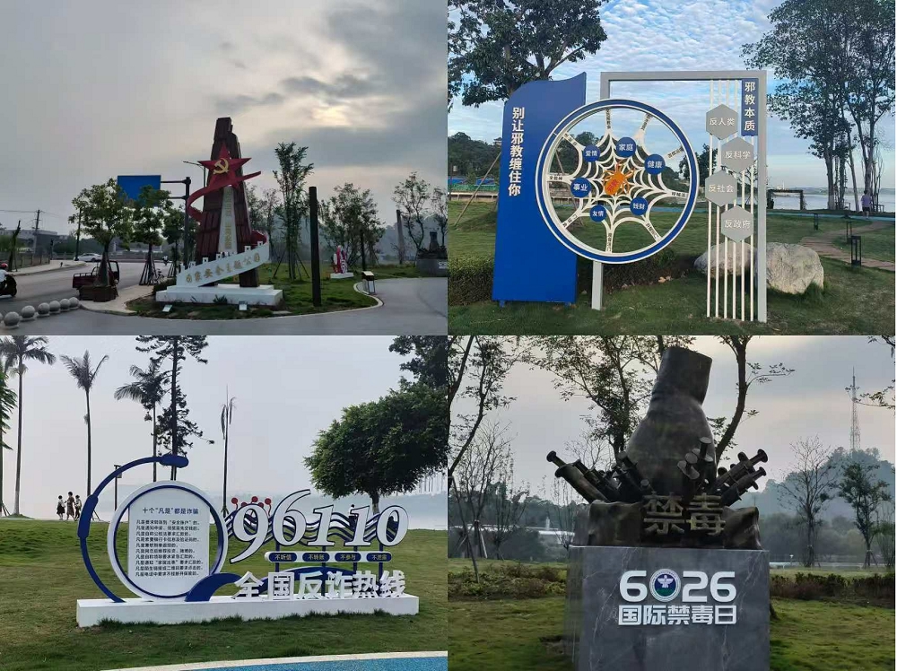 主题公园依托原有公园景观与设施,将国家安全、禁毒、防邪、反诈宣传与南溪东门生态公园、南溪文化特色有机融合,打造“宣传教育+公园特色”的阵地。其中设置不同的大功能板块,特别设置了网红打卡区,结合国安警察卡通人物、国家安全宣传标语、特色动漫元素和体现国安职能的场景元素,构建沉浸式宣传教育空间,以网红拍照打卡的形式,增强公众参与感,助力全民国家安全意识提升。