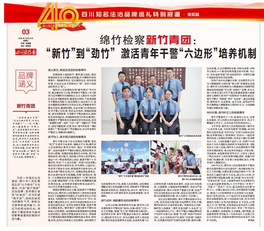 为进一步强化队伍建设,绵竹市人民检察院立足“以竹育检”文化理念,打造“新竹青团”法治品牌,坚持理论业务“双驱动”,学习实践“两手抓”,培树忠诚担当的秉性气节,磨砺出类拔萃的业务能力,牢记为民司法的初心,将青年干警培养成为推动检察事业蓬勃发展的中坚力量。