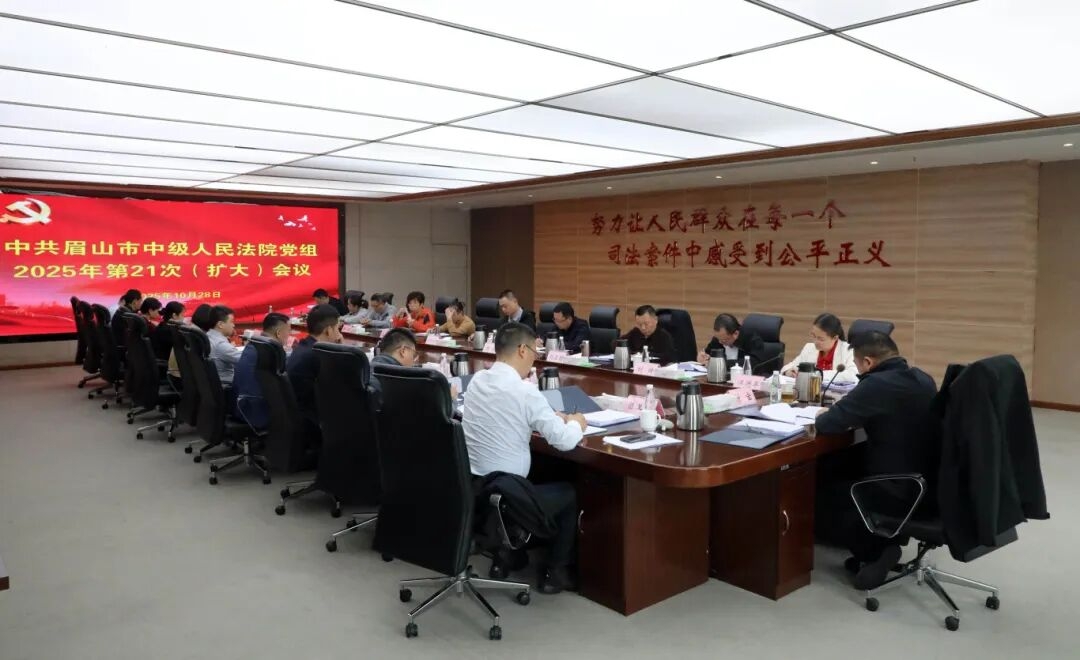 10月28日,眉山中院召开党组(扩大)会议,传达学习党的二十届四中全会,省委常委会(扩大)会议、市委常委会(扩大)会议精神和市委政法委员会全体(扩大)会议精神,研究贯彻落实意见。眉山中院党组书记、院长付宝主持会议并讲话。