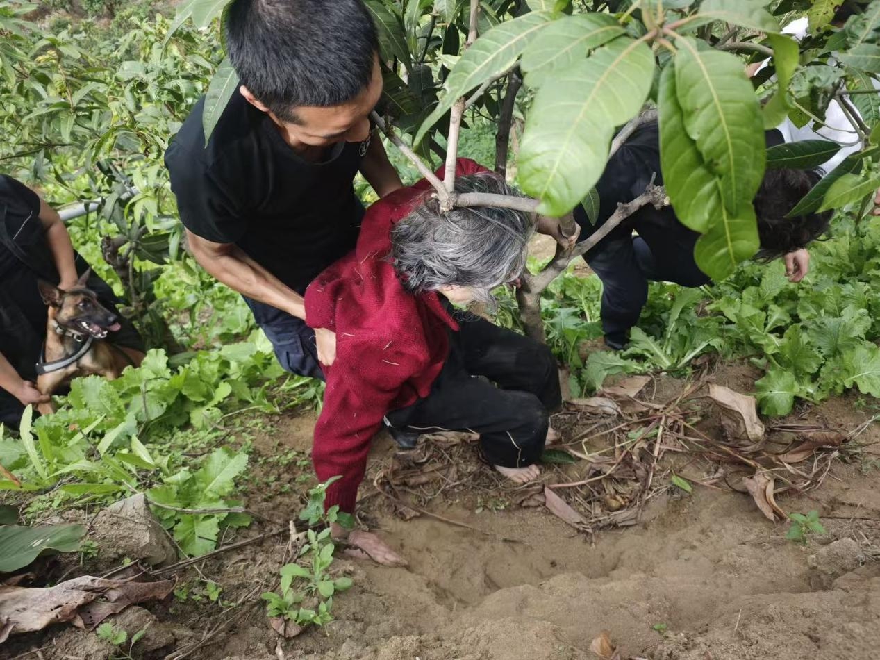 四位队员迅速重返现场,再次以老人遗留的衣物作为嗅源,结合周边地形进行研判,展开地毯式搜索。在吴玉林的指令下,“吉米”回到首日丢线的水塘边,重新赋予嗅源。此时,“吉米”突然兴奋起来,仿佛又捕捉到了那熟悉的气味。它沿着马路追出约200米后,一头冲进芒果地。几分钟后,“吉米”在一处芒果树旁作出明确示警反应。队员们迅速上前,发现老人摔倒在芒果坡地下,因长时间未进水和食物,已呈半昏迷状态。队员们立即对老人进行施救,并联系了家属。