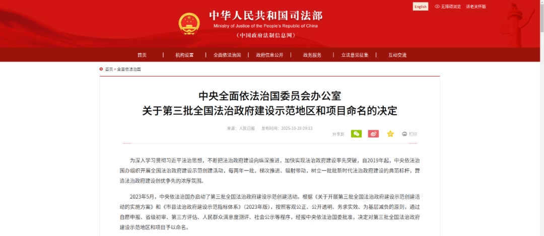 10月28日,经报中央依法治国委批准,中央全面依法治国委员会办公室决定对第三批全国法治政府建设示范地区和项目予以命名,资阳市被命名为“全国法治政府建设示范市”。
