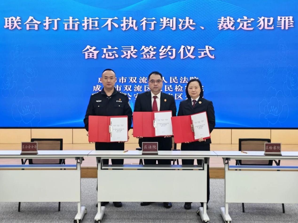 为进一步强化打击拒不执行判决、裁定犯罪的协同作战能力,有效提升执行工作效能,切实维护司法权威与当事人合法权益,11月11日,成都市双流区人民法院、区人民检察院、区公安分局共同举行《关于联合打击拒不执行判决、裁定犯罪的备忘录》签约仪式。