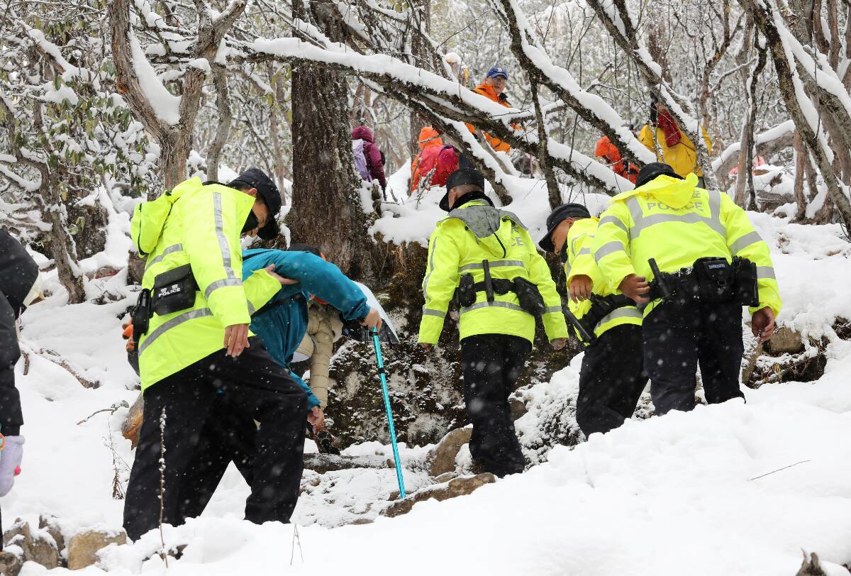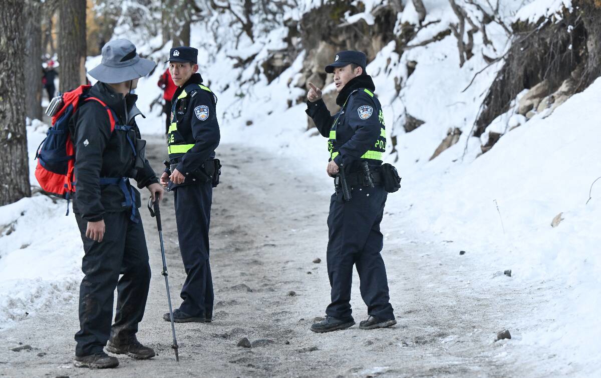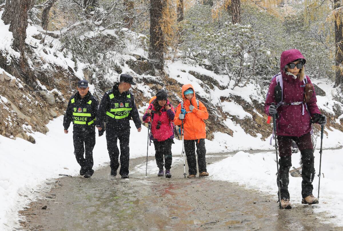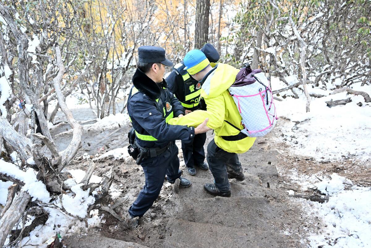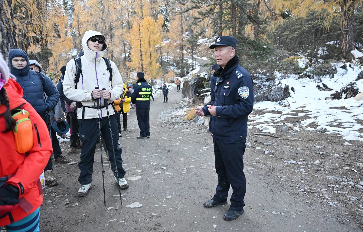 11月5日,当记者在党岭见到丹东派出所所长泽仁时,连日在风雪中高强度的救援工作,让他走路都一瘸一拐的,却仍拄着拐杖坚持在巡护一线。在顶风冒雪维护景区排队秩序时,他的声音已经嘶哑,这份坚守与担当,也温暖了过往游客的心。有游客看见他在风雪中执勤,身上衣物单薄,主动将自己的户外衣物递给他御寒,这一幕,温暖了寒风中的彼此,成为雪山下警民同心的最美定格。