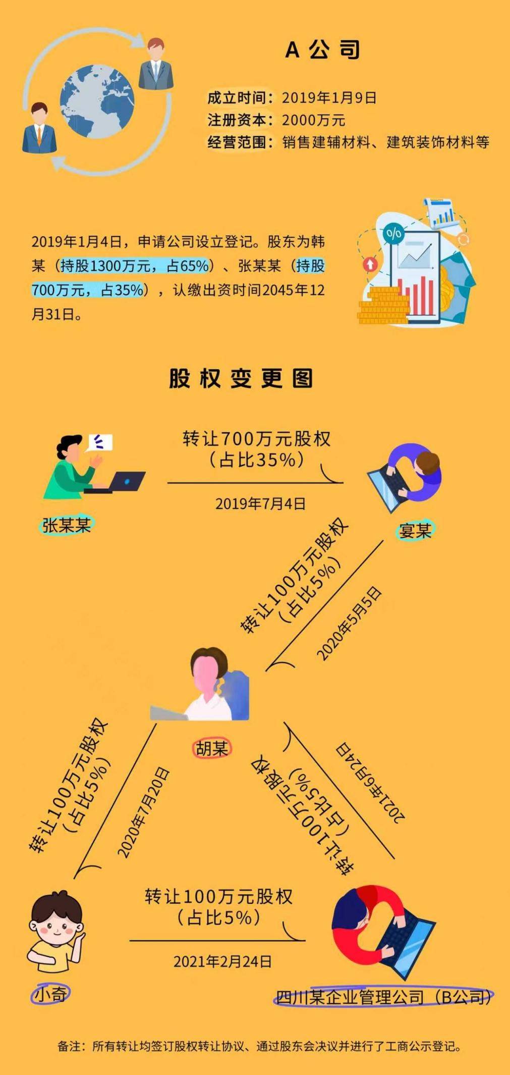2019年7月,张某某将其所持的35%股权转让给晏某;2020年5月,晏某将持有的5%股权转让给胡某,后该100万元股权又先后被转让给实习生小奇、四川某企业管理公司(B公司)。直至2021年6月,B公司将该股份转回了胡某。以上转让均签订股权转让协议、通过股东会决议并进行了工商公示登记。