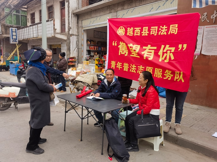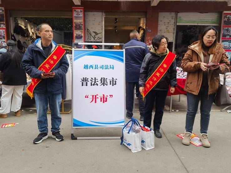 在彝族年前以周边乡镇赶场的契机,越西县司法局“嶲望有你”青年普法服务团紧抓赶场人流量大、过节氛围浓的特点,以“赶”法治新潮、“摆”法治干货为主线,把法律宣传搬进了热闹集市里,将普法宣传与传统节庆融合,打造群众“赶得热闹、摆得明白”的法治文化盛宴。