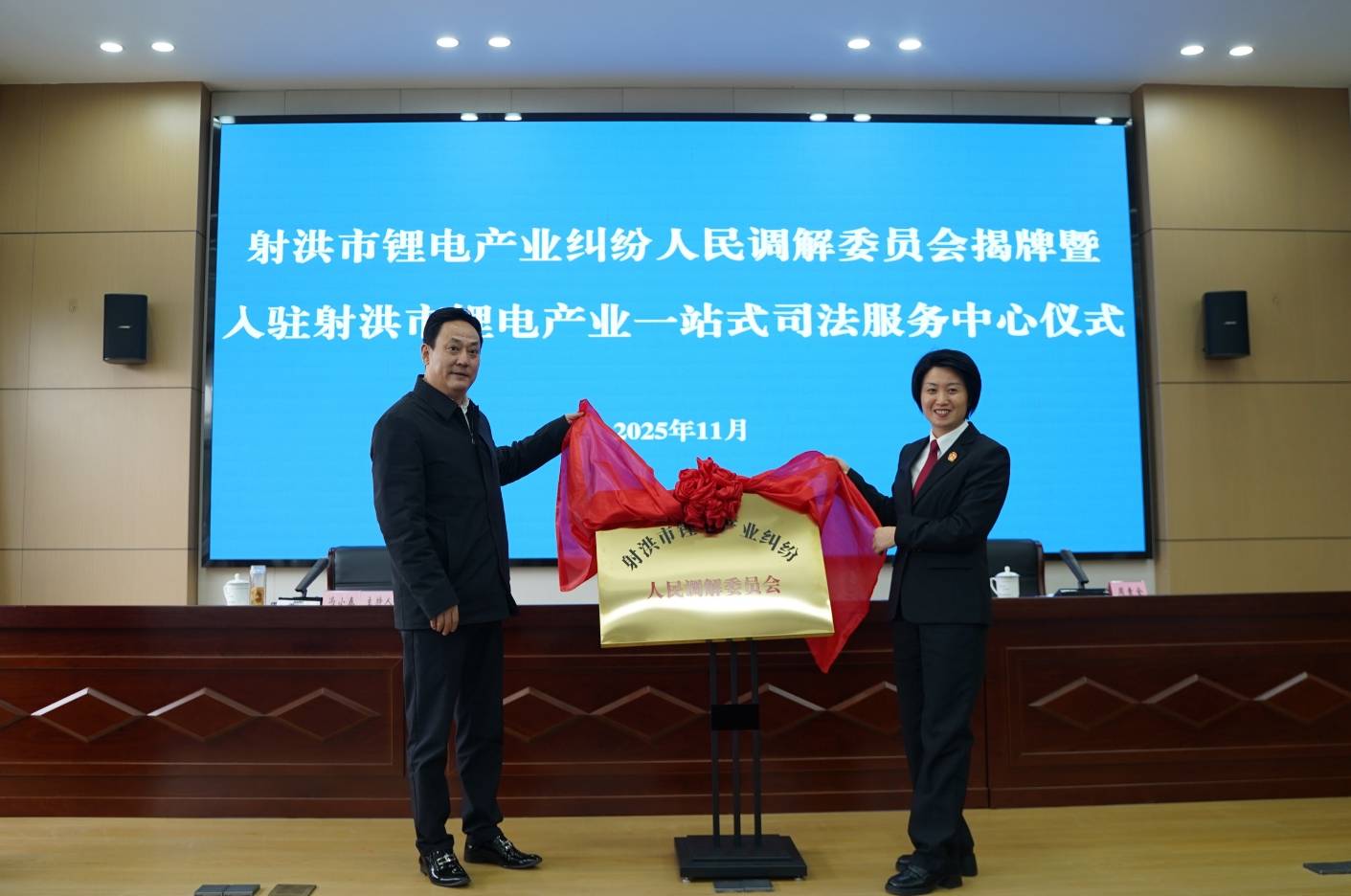 2025年11月19日,射洪市锂电产业纠纷人民调解委员会正式揭牌成立,并入驻射洪市锂电产业纠纷一站式司法服务中心,射洪市委常委、政法委书记文加武,射洪市人民法院党组书记、院长周素全,四川射洪经开区党工委委员、纪工委书记冯小春出席会议。