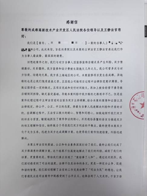 近日,成都高新区法院成功调解一起疑难复杂的装饰装修合同纠纷、建设工程设计合同纠纷。当事人特地寄来一封情真意切的感谢信,为法官点赞。
