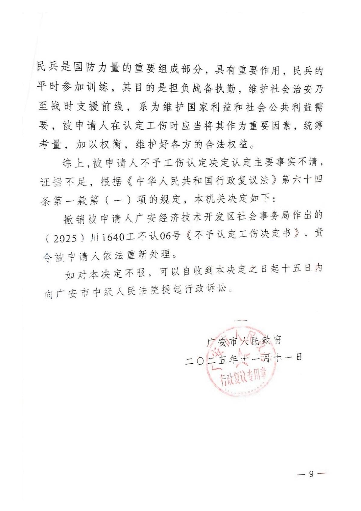 2025年11月11日,广安市人民政府作出行政复议决定,撤销被申请人作出的《不予认定工伤决定书》,责令其依法重新处理。