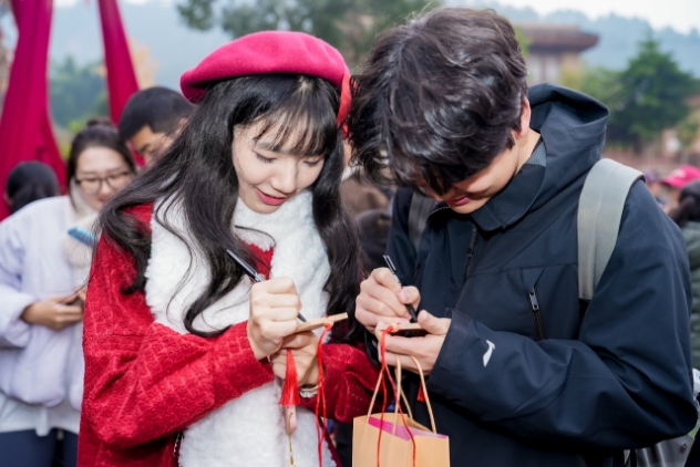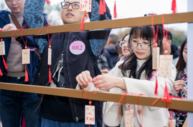 11月29日清晨,丹棱幸福古村夫妻树下,一对小情侣张苹和高缘认真写下祈福牌,仔细系在祈福墙上。当天,2025长江之恋——“嘉唐”千里婵娟・缘起东坡系列活动“东坡爱情地图”打卡最后一站在丹棱幸福古村举行。这场以古村为舞台的活动,为四十余对情侣夫妻带来了一场沉浸式幸福体验。