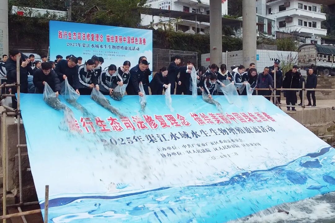 为切实修复水生生态环境,12月3日,由广安市广安区委政法委牵头,广安市广安区法院、区检察院、区公安分局、区农业农村局、区水务局等多部门在渠江广安段开展生态环境司法修复增殖放流活动。