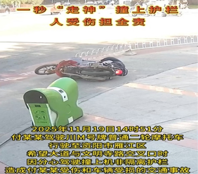 12月4日,据资阳市公安局交通管理支队通报,11月19日14时51分,付某某驾驶川M号牌普通二轮摩托车行驶至资阳市雁江区希望大道与文明寺路交叉口时,因分心驾驶撞上机非隔离护栏,造成付某某受伤和车辆受损的交通事故。