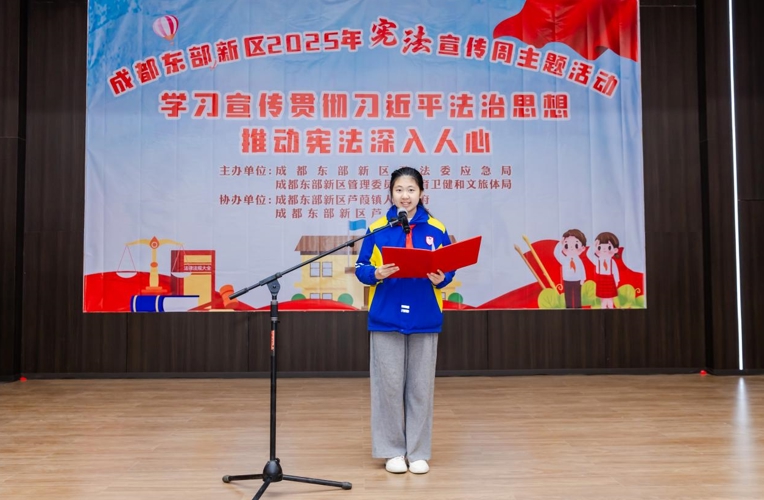 为深入学习践行习近平法治思想,持续推动宪法学习宣传走深走实,弘扬宪法精神,筑牢法治根基,12月4日,成都东部新区政法委应急局、教卫文体局携手芦葭镇人民政府及芦葭学校,共同举办以“学习宣传贯彻习近平法治思想,推动宪法深入人心”为主题的2025年宪法宣传周活动。活动围绕“我心中的宪法”手抄报创作、“宪法之光伴我成长”主题朗诵、宪法趣味乐园三大板块展开,形式多样、内容丰富,营造了浓厚的校园法治文化氛围。