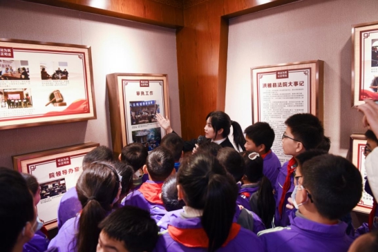 “哇哦,家事庭的桌子跟我家里吃饭的圆桌好像!”“原来洪雅县法院1951年就成立了!”“以前法官的制服跟军人一样。”结合讲解与实地感触司法,同学们都不由地发出感慨,司法的轮廓在他们心中立体起来。