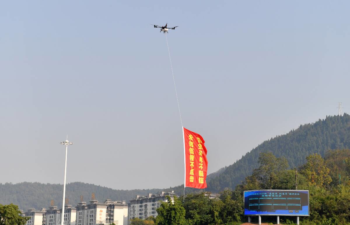 “个人信息不透露 转账汇款多核实”“未知链接不点击 陌生来电不轻信”,近日,在达州市梨树坪湿地公园上空,两架大型无人机悬挂着印有反诈宣传标语的条幅在空中盘旋,宣传着防骗反诈知识。