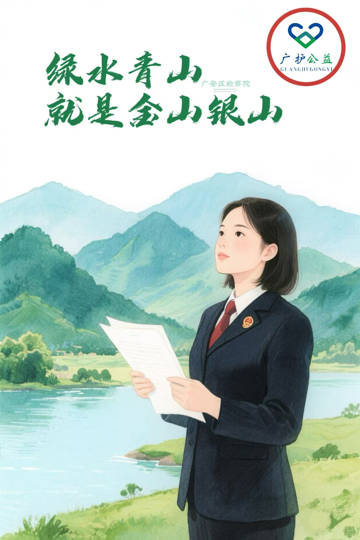 “广护公益”品牌Logo主体为青山、绿水、检察蓝简画标识,蓝色双手既展现检察公益诉讼维护公共利益的核心职能,又传递检察专业、可靠、为民的品牌形象。