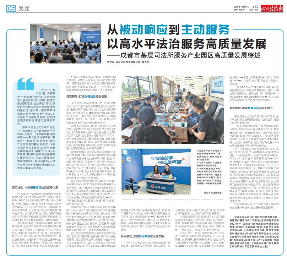 如何以法治之力托举产业之兴?成都市司法行政系统用一年时间,交出了一份厚重而鲜活的答卷——深入贯彻成都市委、市政府“立园满园”行动部署,聚焦产业园区高质量发展主线,以基层司法所为主阵地,整合全系统法律服务资源,构建“产业链+法律服务”新格局,推动法治化营商环境持续优化,为助力成都建设西部经济中心、科技创新中心、对外交往中心和全国先进制造业基地注入坚实法治动能。