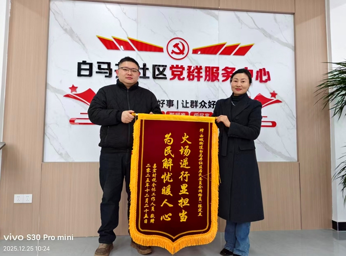 12月24日下午2时35分,巴中市巴州区西城街道白马井社区建兴苑网格1号楼11楼住户家中突发火情,社区党员、网格员陈定立闻险而动,及时处置化解险情,守护了居民生命财产安全。事后,心怀感激的张女士专程为陈定立送上锦旗,鲜红锦旗承载着居民对基层守护者最真挚的谢意。