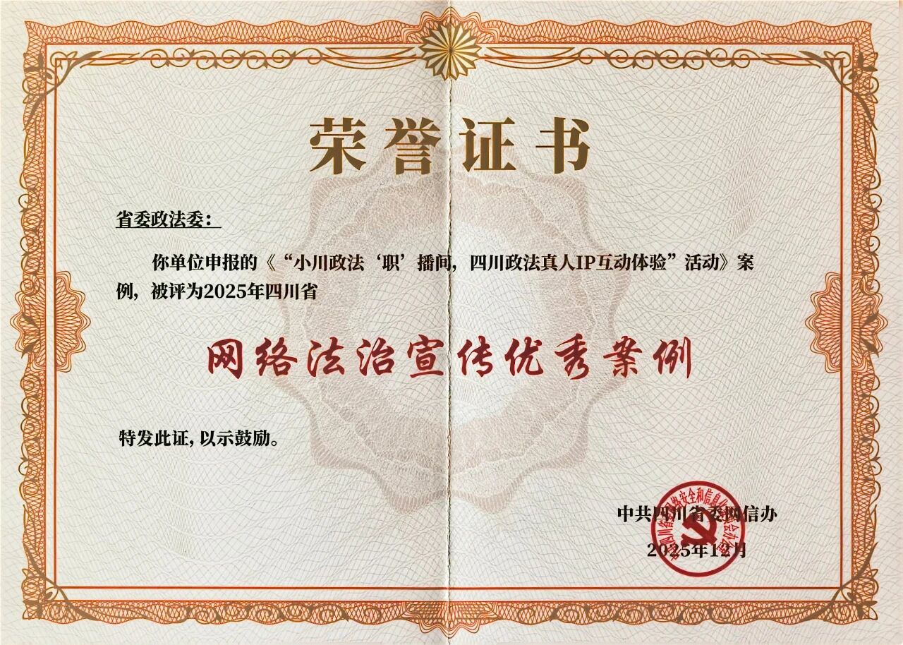 “小川政法‘职’播间——四川政法真人IP互动体验”活动被评为“2025年四川省网络法治宣传优秀案例”。