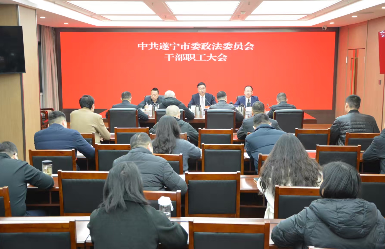 12月31日下午,遂宁市委政法委召开干部职工会传达学习市委八届十二次全会暨市委经济工作会议精神,研究贯彻落实意见。市委常委、政法委书记张智勇主持会议并讲话。