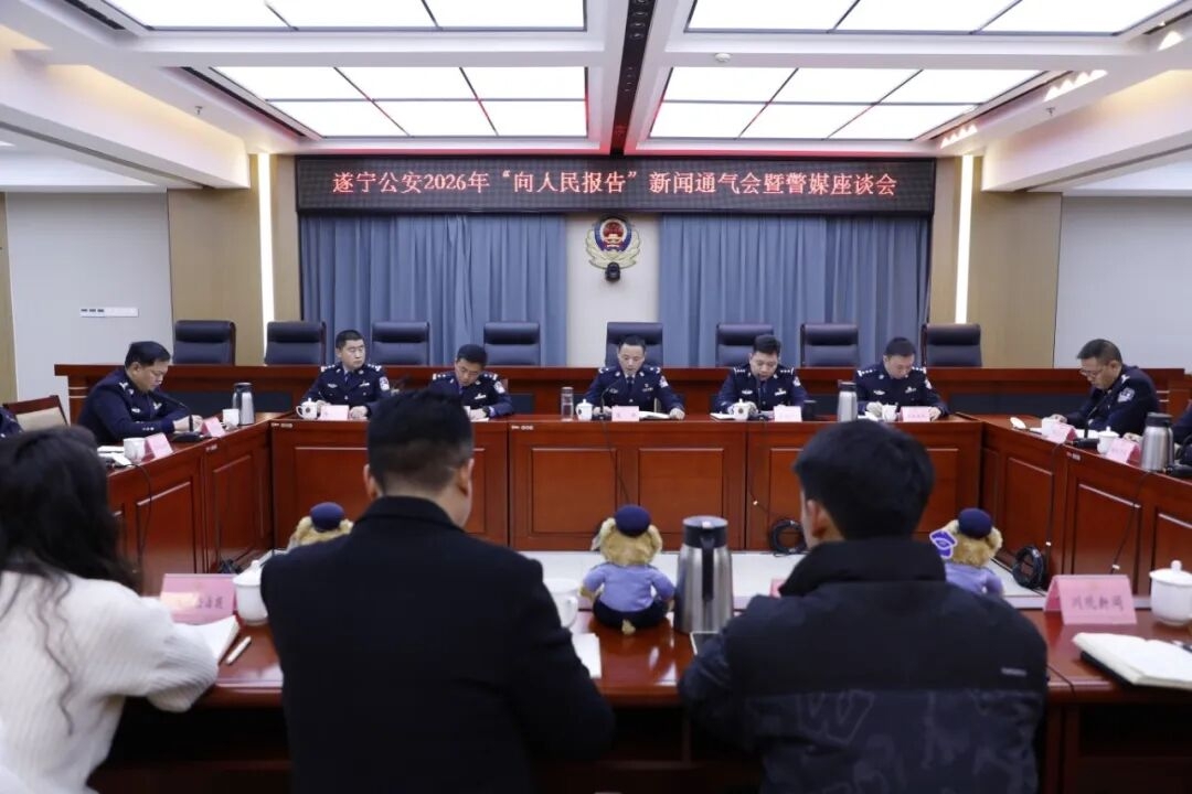 1月7日上午,遂宁市公安局召开“向人民报告”2026年新闻通气会暨警媒座谈会,回顾遂宁公安2025年的坚实足迹、奋斗征程。会议邀请中、省级驻遂媒体以及本地主流媒体代表参加,遂宁市公安局党委委员、政治部主任聂洪出席会议并讲话,遂宁市公安局情指、治安、刑侦、网安、交管、经侦、法制、环食药侦、森林公安等部门主要负责同志参加会议并通报2025年全市公安机关打击犯罪、服务群众、护航发展的有关情况。
